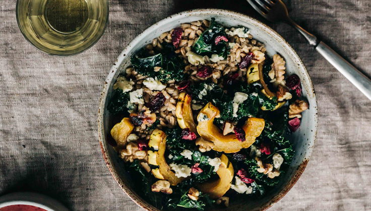 This grain bowl with delicata squash and cranberry dressing is a lovely combination of flavors and textures.